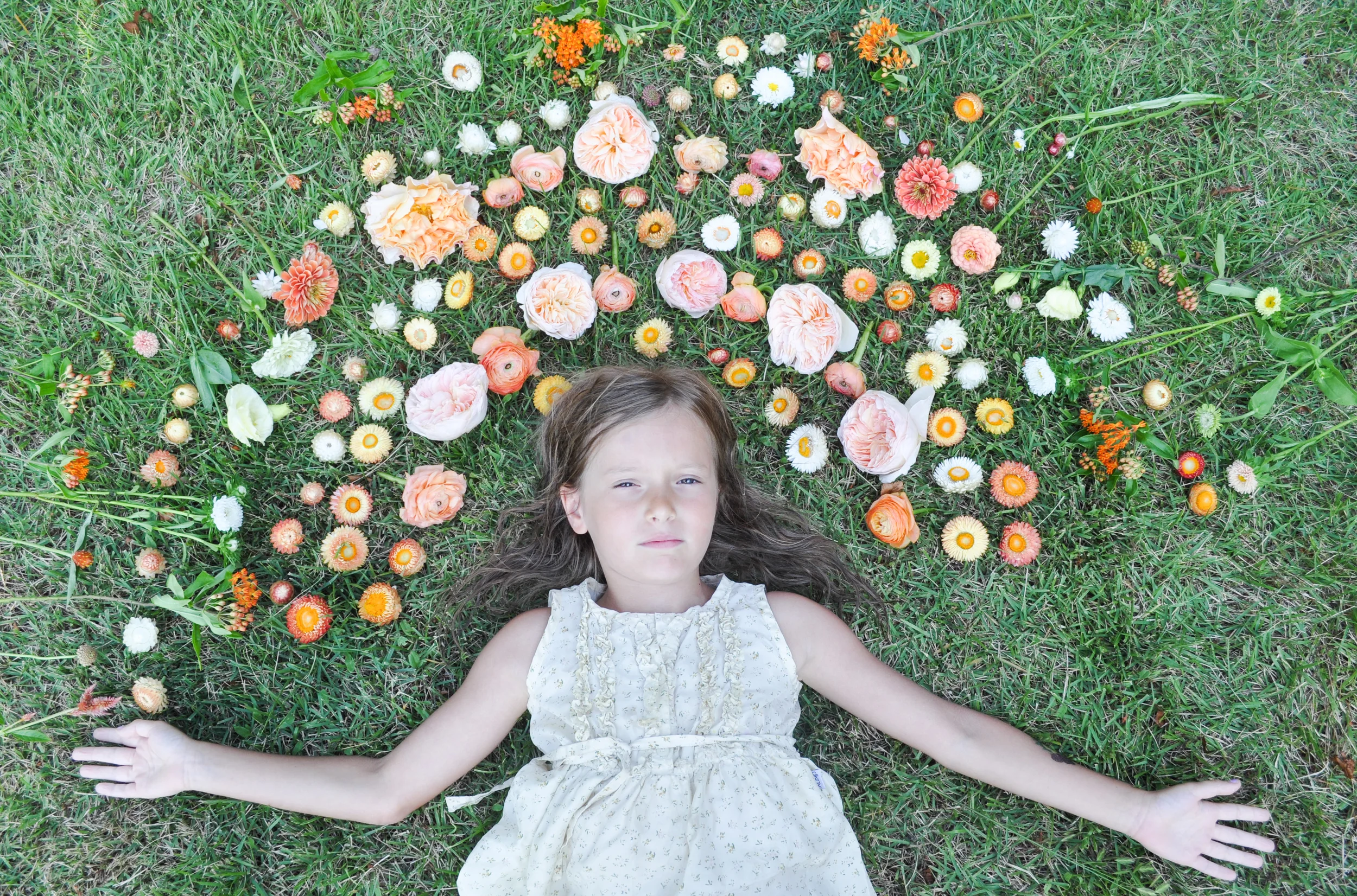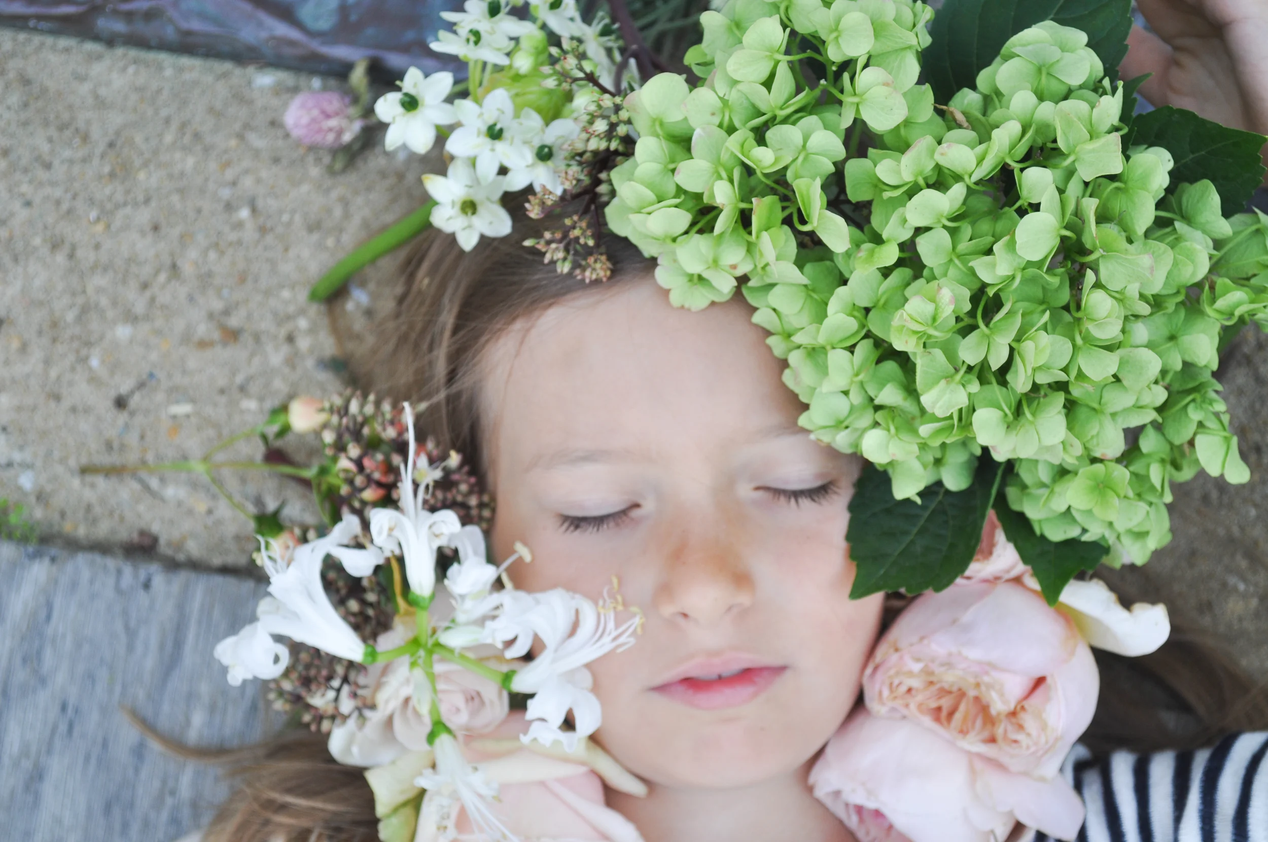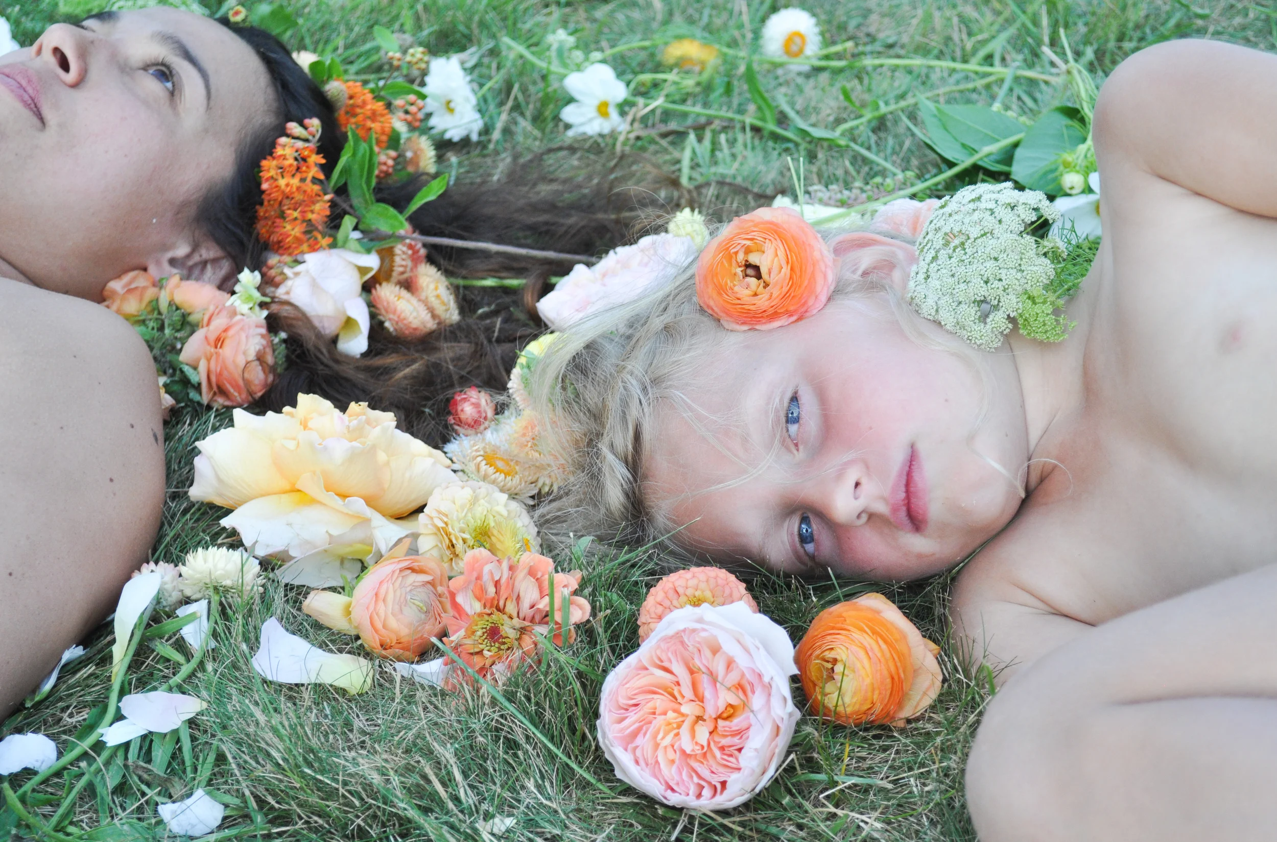 The day after the wedding as the sun sunk low in the sky, my mother, daughters and my sister's dearest friend, Kate, journeyed back to the site of the wedding. The land was rich with the energy of the day before and we wandered the fields toward dusk. But before we went wandering there was work to do, a gathering and dismantling of the remnants left behind. Clusters of tiny vases, silver and glass, porcelain and wood, were flocked outside the barn doors. We spent a good hour at play, disassembling arrangements and rearranging them in the grass, strewn over each others' bodies, tossed in the air to see where they fell. Somehow I cajoled one of my daughters into playing the role of an ethereal nymph, and Kate gamely obliged my request as well. I can't even begin to explain how powerful these remains of the day before were. They held a bewitching energy beyond any words I might share with you. I organized and repositioned, strategized on how to coax the right expression from the lovely creatures captivated amongst these petals and stamen. And some how the magic of these blooms seemed to vibrate and we were hooked. For days afterward I offered ice cream and adventures to my daughters and niece in exchange for their playing along and wandering into flower land with me. I think each of us found something to savor as we dreamed our way into a surreal world of botanics.