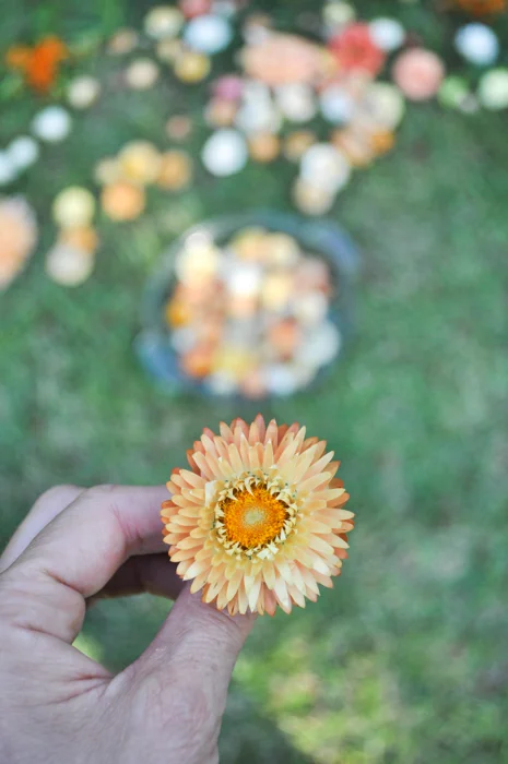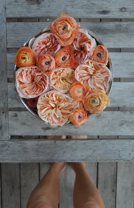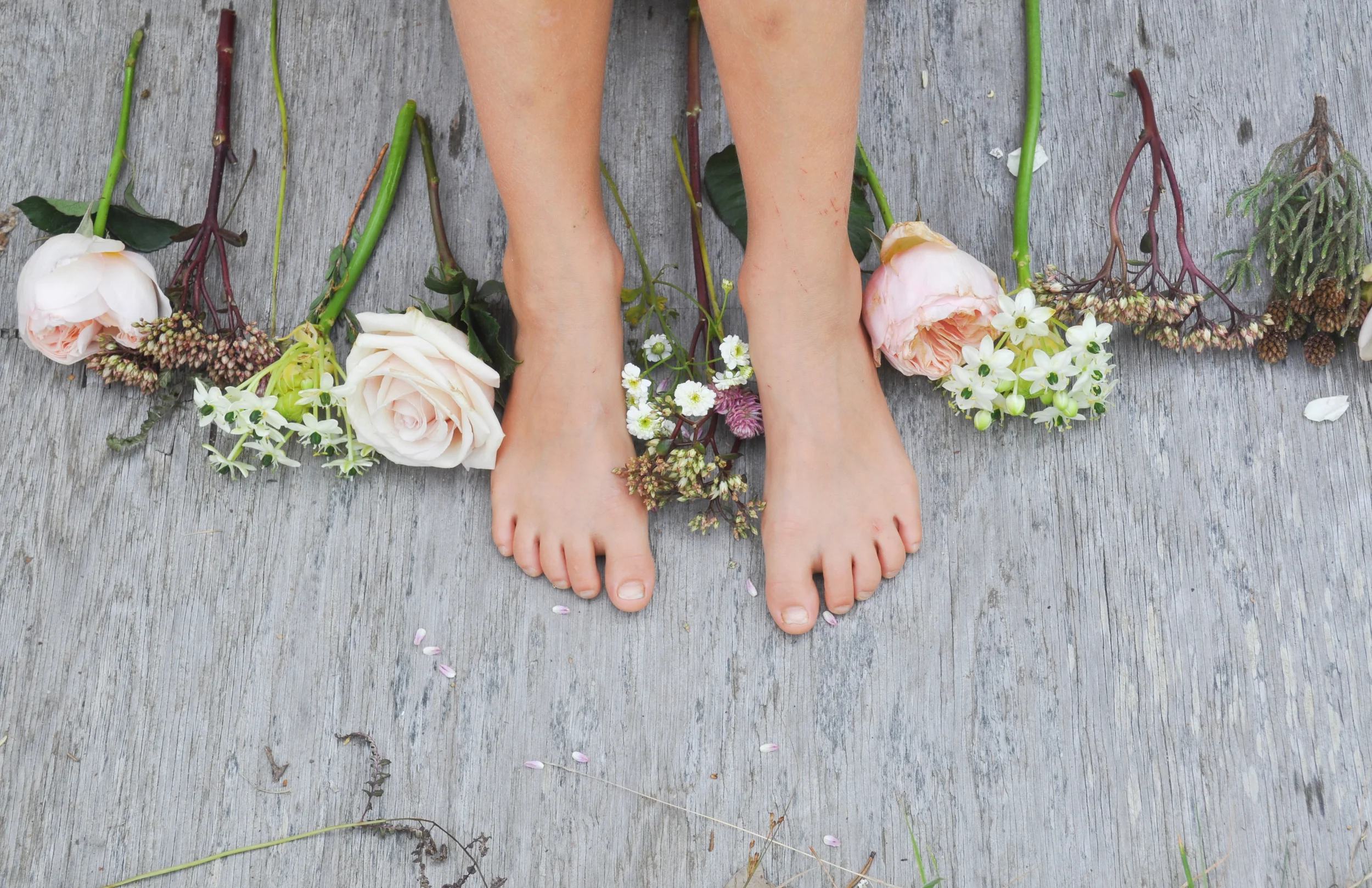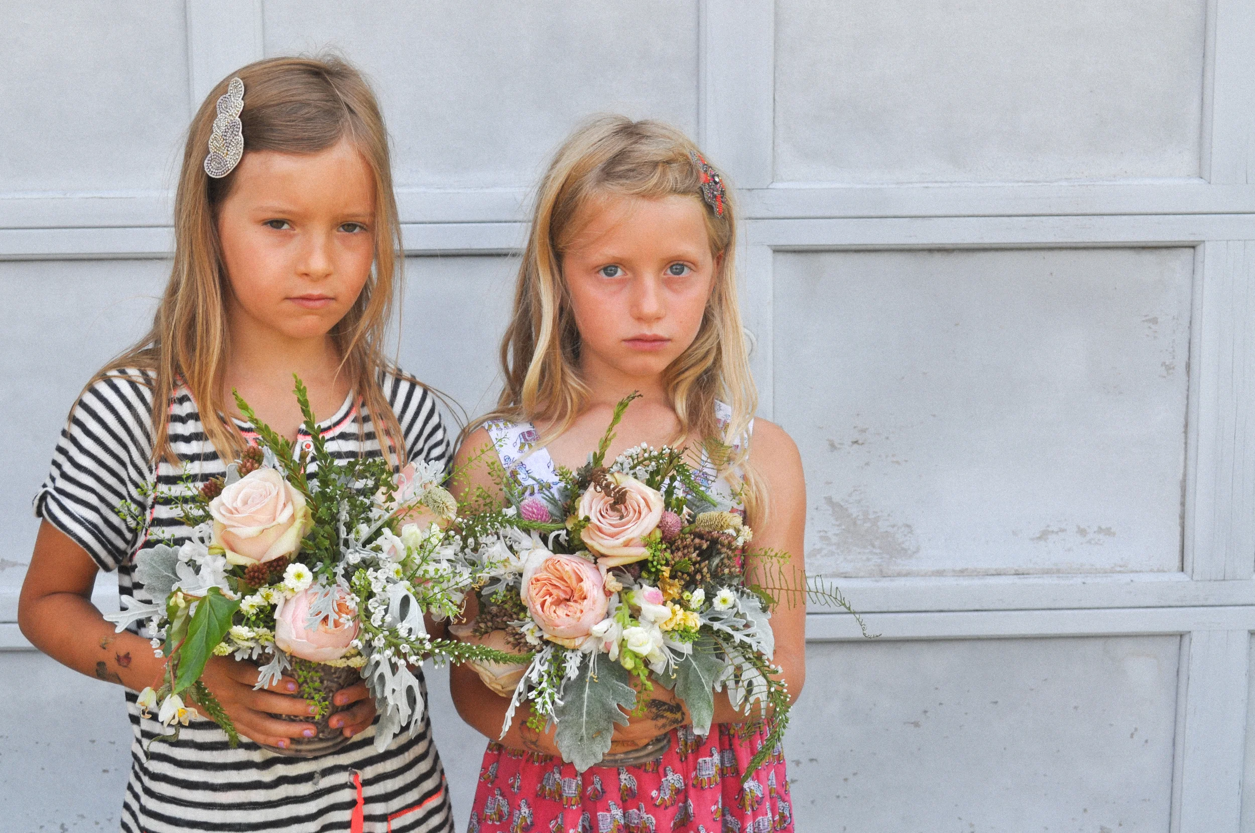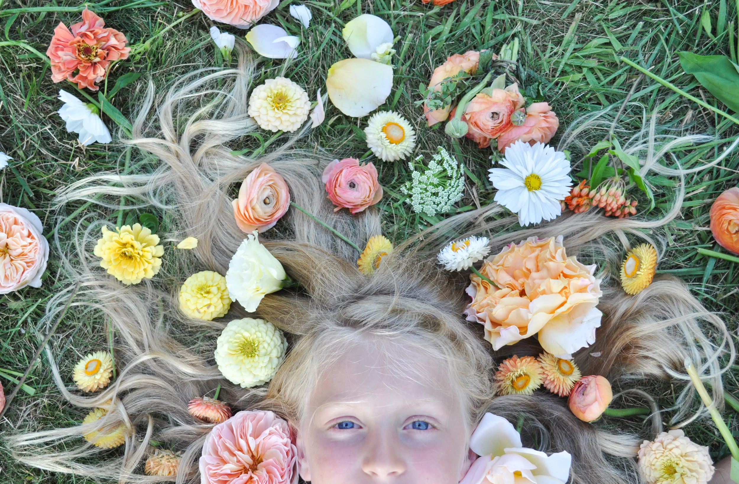 The day after the wedding as the sun sunk low in the sky, my mother, daughters and my sister's dearest friend, Kate, journeyed back to the site of the wedding. The land was rich with the energy of the day before and we wandered the fields toward dusk. But before we went wandering there was work to do, a gathering and dismantling of the remnants left behind. Clusters of tiny vases, silver and glass, porcelain and wood, were flocked outside the barn doors. We spent a good hour at play, disassembling arrangements and rearranging them in the grass, strewn over each others' bodies, tossed in the air to see where they fell. Somehow I cajoled one of my daughters into playing the role of an ethereal nymph, and Kate gamely obliged my request as well. I can't even begin to explain how powerful these remains of the day before were. They held a bewitching energy beyond any words I might share with you. I organized and repositioned, strategized on how to coax the right expression from the lovely creatures captivated amongst these petals and stamen. And some how the magic of these blooms seemed to vibrate and we were hooked. For days afterward I offered ice cream and adventures to my daughters and niece in exchange for their playing along and wandering into flower land with me. I think each of us found something to savor as we dreamed our way into a surreal world of botanics.
