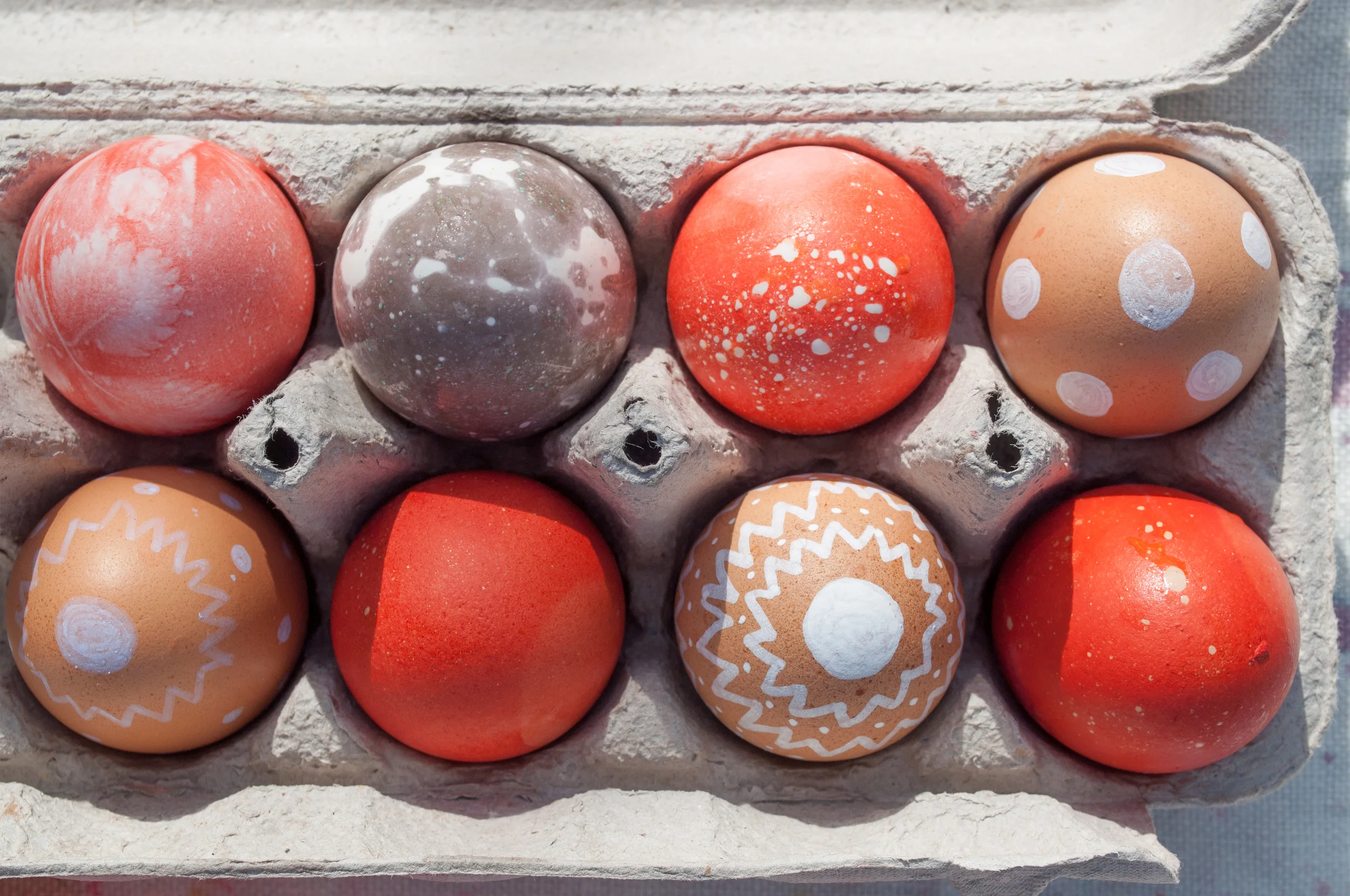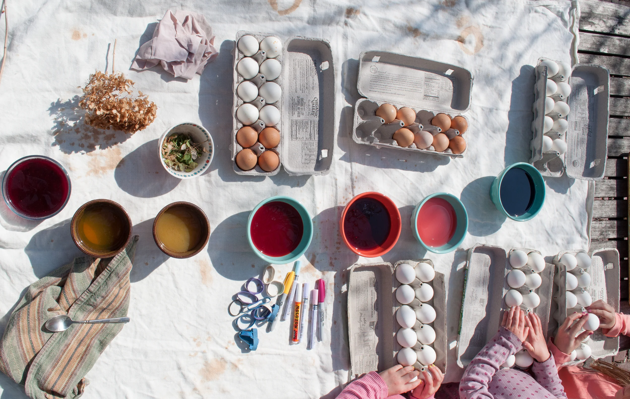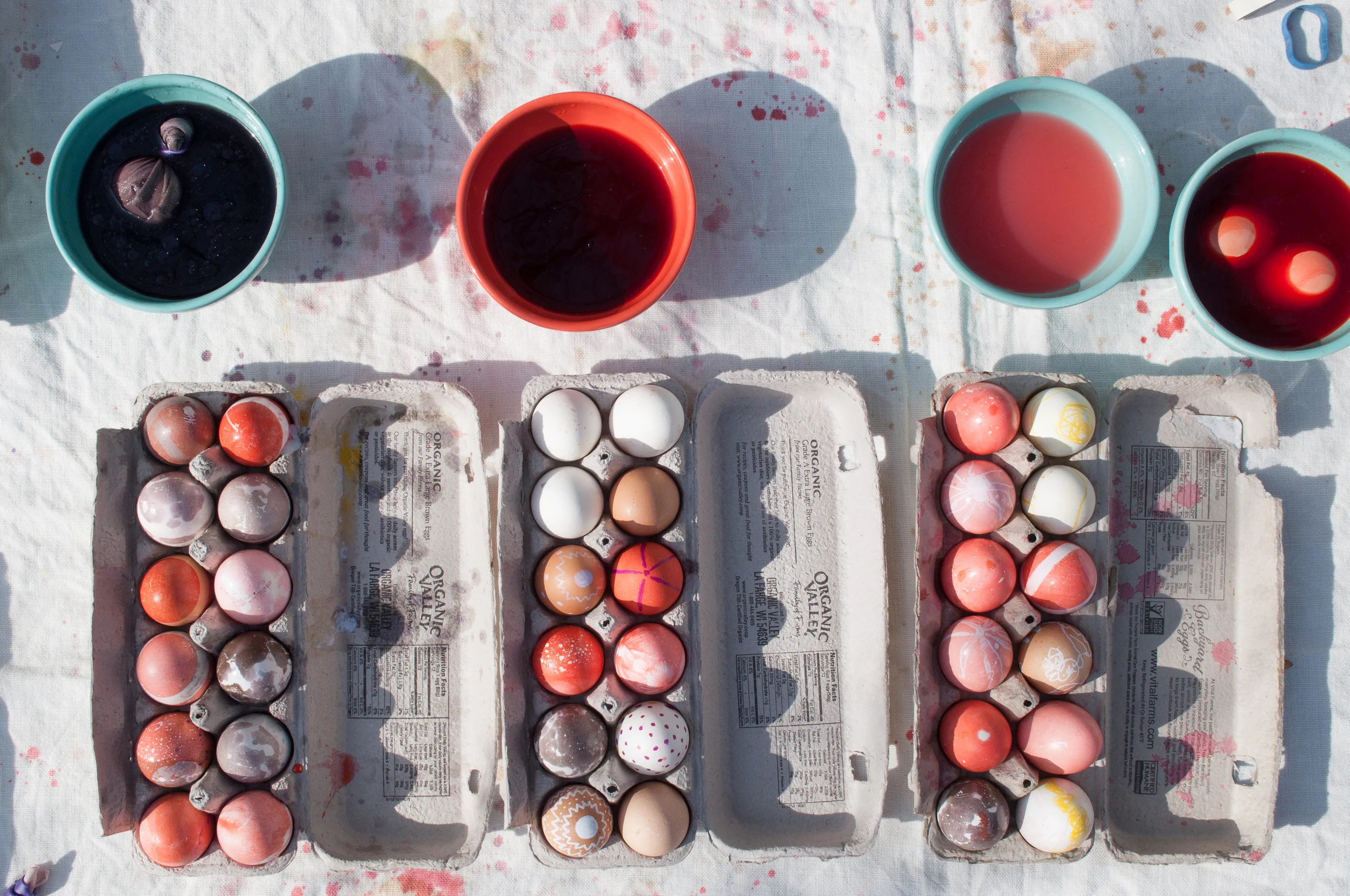 And I think we did a pretty good job of making said art. There was a good amount of set-up required, but the results were worth it. I have an affinity for natural dyes and making everything myself, sometimes it works like a dream, and other times, not so much. Three years ago we experimented with beets, tumeric and blueberries to imperfect effect, but I've steadily honed my craft and this year tumeric and red cabbage created deep and satisfying colors after an overnight soak in their color baths.