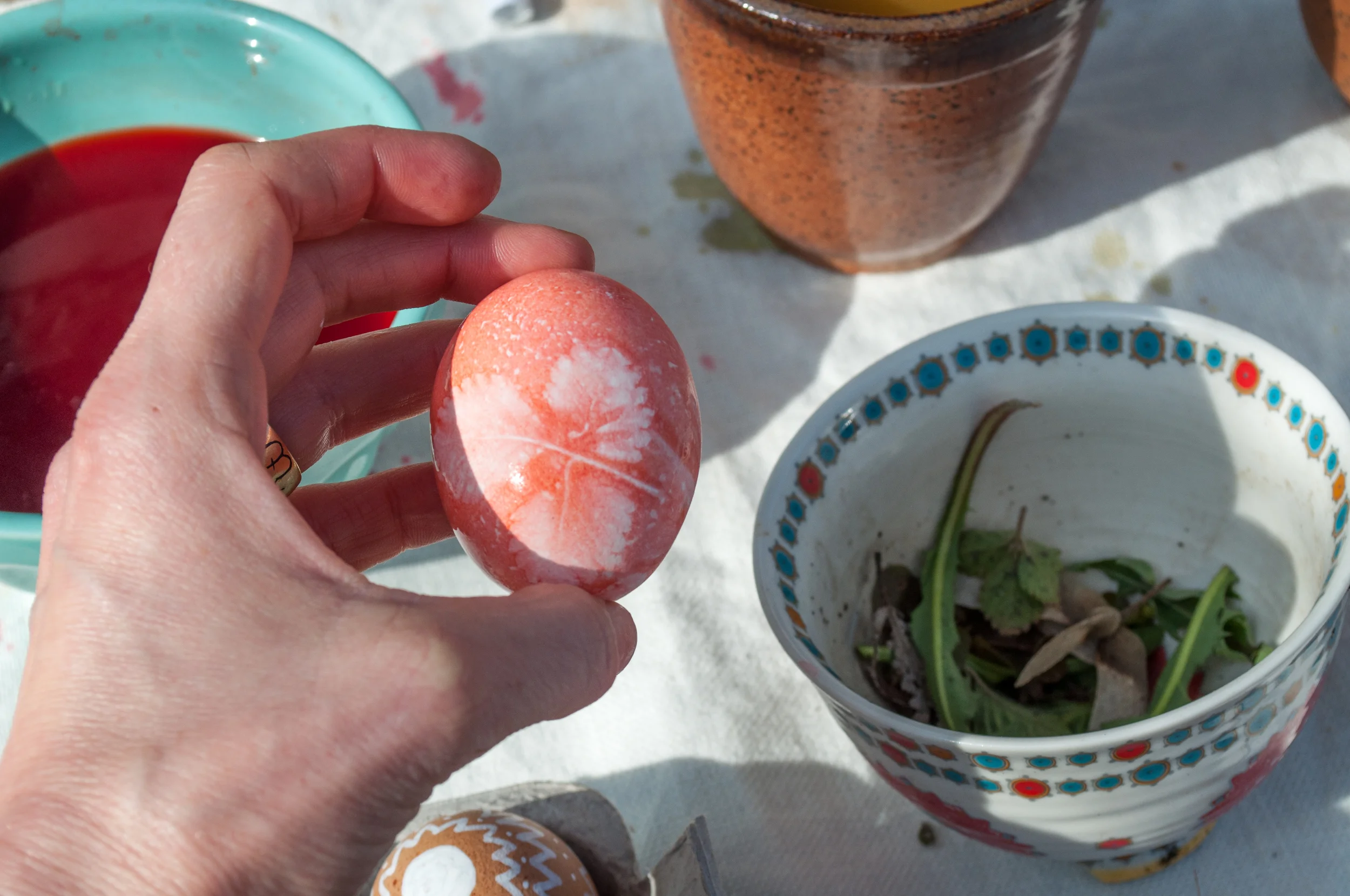 My girls were in the market for more of a quick fix and although factory farmed conventional eggs and kool-aid aren't exactly things I have any desire to support, sometimes I bend a little. Paint pens from the local art store and kool-aid mixed with oil helped us create pretty dreamy marbleized and patterned eggs. We also experimented with collecting leaves and blooms from around the neighborhood, pressing them to our eggs, then wrapping and securing old stocking around the egg to hold the plant matter in place. These eggs were dunked in kool-aid and when peeled apart created cool shadow prints!